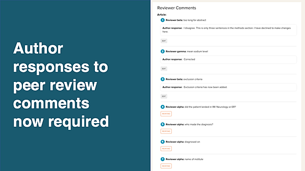 Based on feedback we have received from authors, reviewers, and editors, we now require submitting authors to respond to each peer review comment. These responses will only be visible to the editors and will facilitate faster, more efficient editorial review. The result? Faster publication.