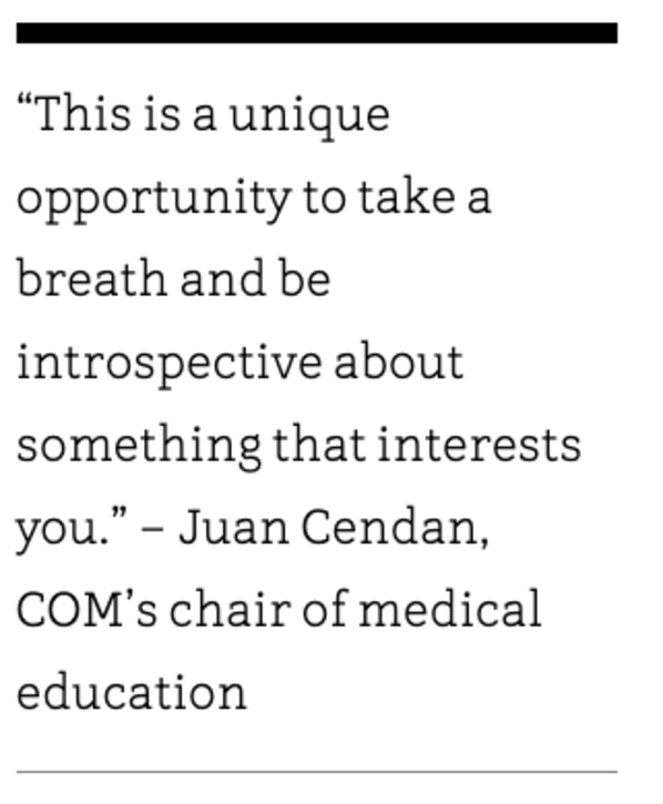 As students, faculty and staff work remotely because of the COVID-19 pandemic, Cendan and other medical school leaders have urged colleagues to use the time away from campus to do research and other scholarly activity. “This is a unique opportunity to take a breath and be introspective about something that interests you,” Cendan says, “to reflect on what’s happening in the world at large and study it.”