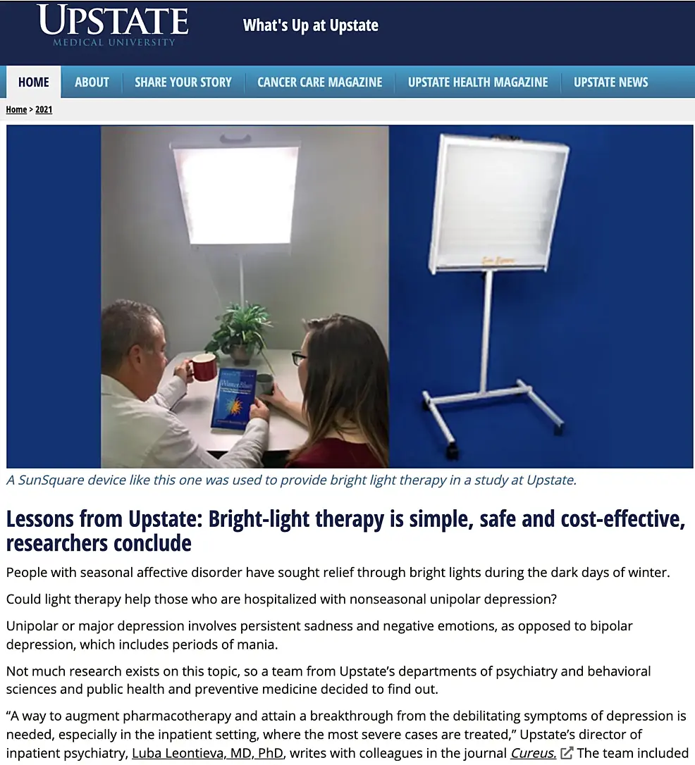 “A way to augment pharmacotherapy and attain a breakthrough from the debilitating symptoms of depression is needed, especially in the inpatient setting, where the most severe cases are treated,” Upstate’s director of inpatient psychiatry, Luba Leontieva, MD, PhD, writes with colleagues in the journal Cureus. The team included psychiatry resident Alyssa Trinh, MD; psychiatric observer and research volunteer Pratik Jain, MBBS; psychiatric nurse practitioner Shaikh Sabahath; Dongliang Wang, PhD, statistician from the department of public health and preventive medicine; and psychiatrist James Megna, MD, PhD."