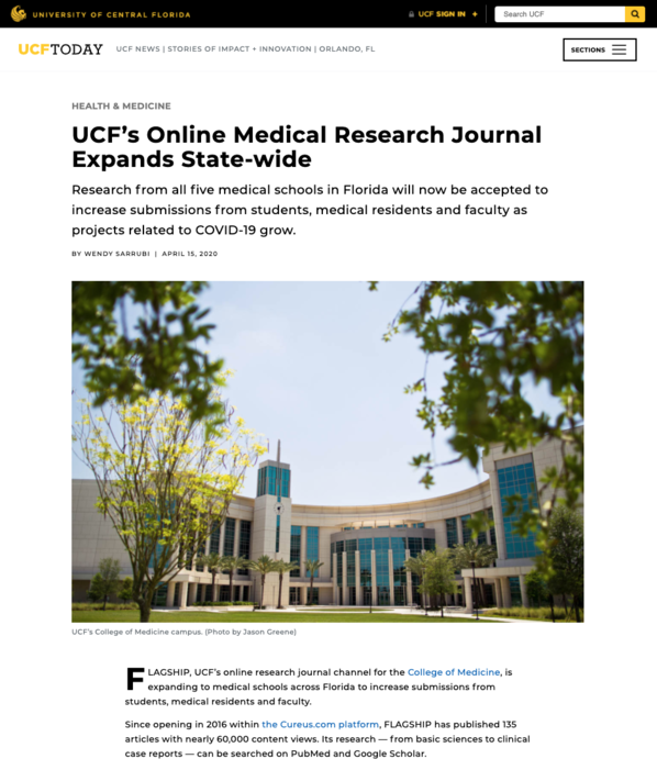 Since opening in 2016 within the Cureus.com platform, FLAGSHIP has published 135 articles with nearly 60,000 content views. Its research — from basic sciences to clinical case reports — can be searched on PubMed and Google Scholar.
